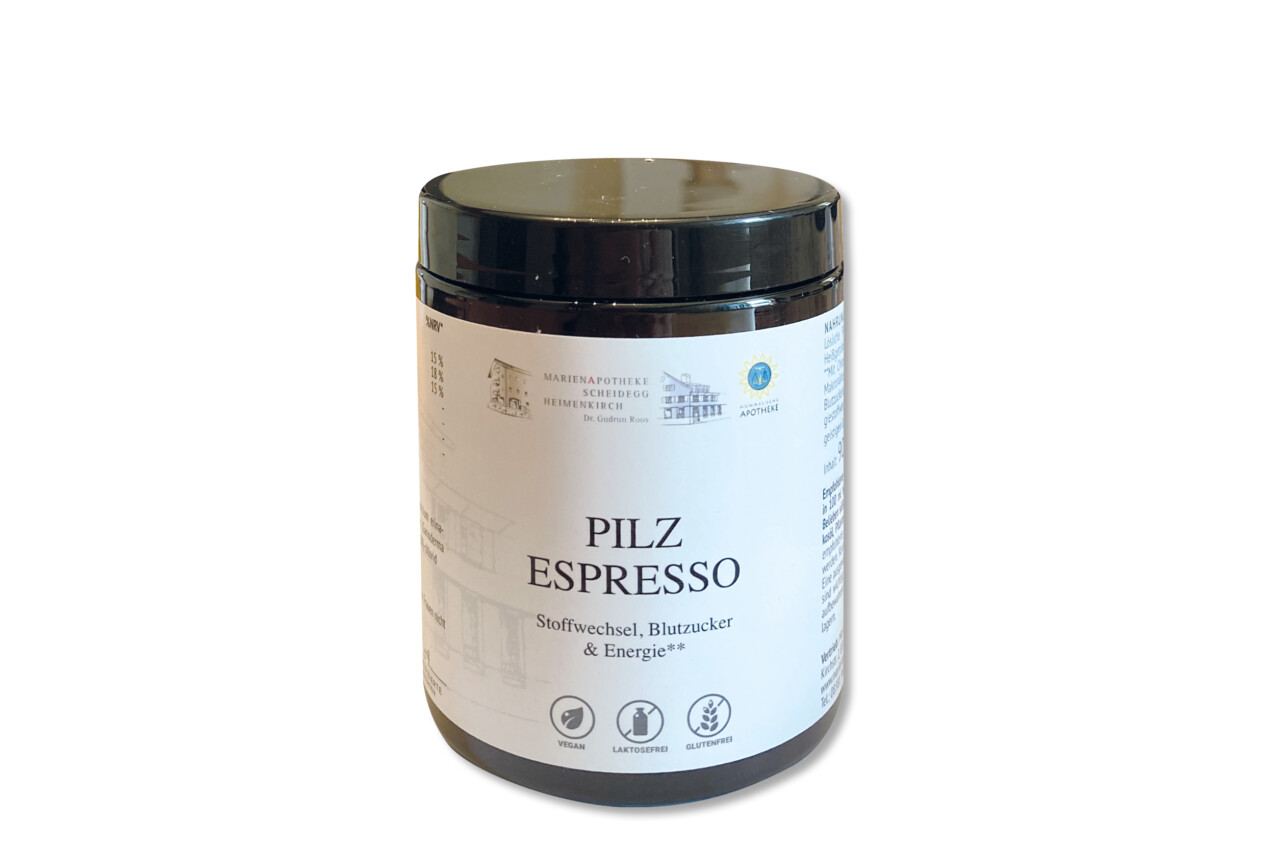 Unser Pilz Espresso trägt zum normalen Fettstoffwechseln (Cholin), zur Aufrechterhaltung eines normalen Blutzuckerspiegels (Chrom), zum normalen Energiestoffwechsel (Niacin) und zur normalen Funktion des Nervensystems (Niacin) bei.